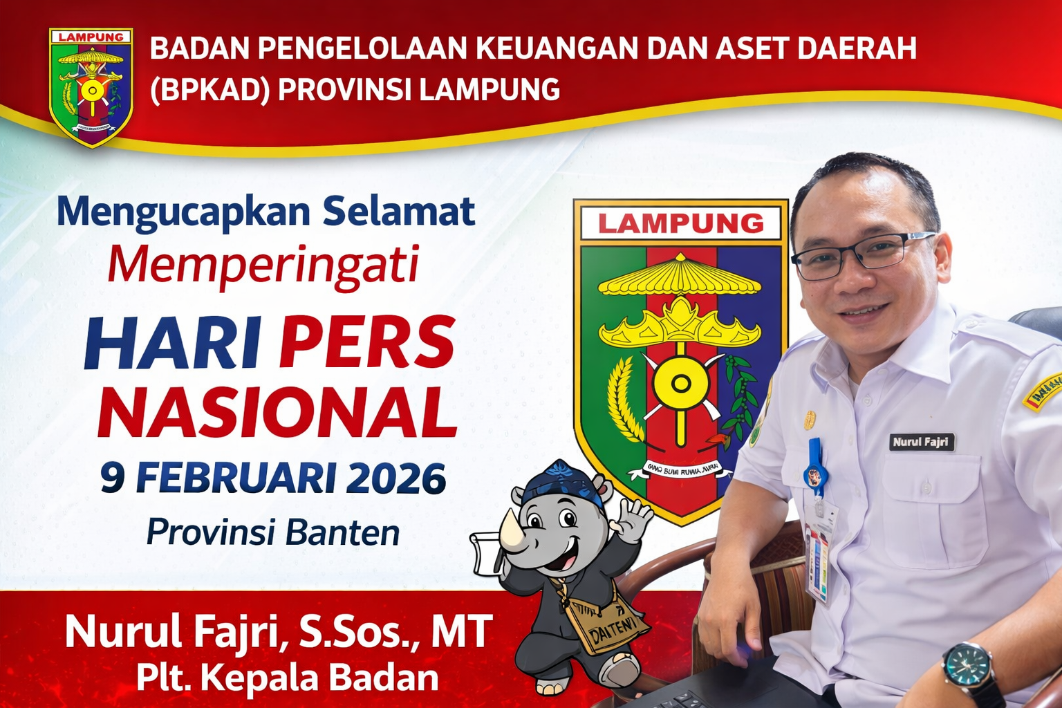 Bandar Lampung, Tipikor news — Pelaksana Tugas (Plt) Kepala Badan Pengelolaan Keuangan dan Aset Daerah (BPKAD) Provinsi Lampung, Nurul Fajri, S.Sos., MT, menyampaikan apresiasi atas peran penting insan pers dalam momentum peringatan Hari Pers Nasional (HPN) 2026 yang dipusatkan di Provinsi Banten, Senin (9/2/2026).